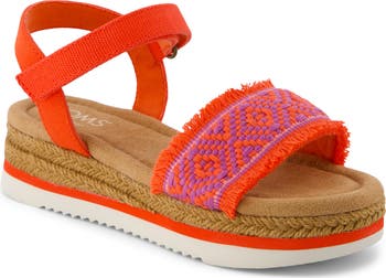 A sawtooth sole and rope-wrapped wedge define a kid-sized platform sandal designed with a woven vamp framed with fraying edges.