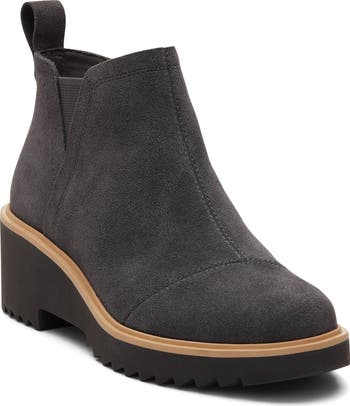 A chunky wedge heel and platform elevate this soft suede bootie built with stretchy side goring and a side zip closure for easy on and off.