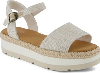 A layered platform gives earthy texture and just-right height to a warm-weather sandal with woven straps and a buckle at the ankle.