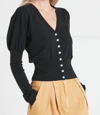Our logo cardigan is an effortless styling staple elevated by diamante buttons for a subtle touch of sparkle. The contrasting puff shoulders and fitted sleeves enhance the feminine design, while the ribbed waist flatters the silhouette.Crafted from 100% cashmere, this cardigan offers exceptional softness, warmth, and lightweight comfort, finished with an understated embroidered T-logo on the chest.