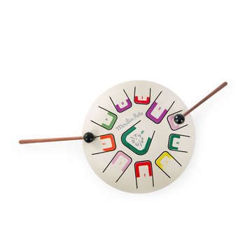 A true introduction to percussion, this tongue drum features 11 notes. It can be played in different ways: with fingertips, hands, or the included drumsticks. The drum comes with a melody booklet and 4 finger picks. Specifications Color: Ecru Recommended Age: 3+ Material: Carbon-steel alloy, rubber, beech wood, ABS plastic Size (inches): Length: 8.668, Width: 5.319, Height: 8.668 Weight (lbs): 1.863225 Care Instructions: Washable with a soft and damp cloth.