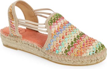 A colorfully woven vamp brightens a breezy wedge espadrille handcrafted in Spain using natural materials and traditional techniques.