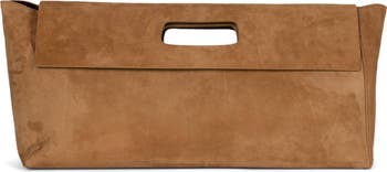 Leather construction softens the utilitarian style of this boxy clutch spacious enough to carry your everyday tools for business and pleasure.