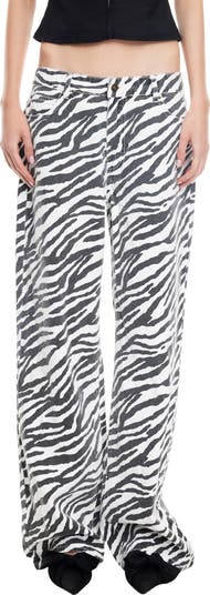 Eye-catching zebra stripes enhances the cool vibes of low-rise, nonstretch-denim jeans cut with trendy wide legs and perfect for taking your night-out look to the next level.