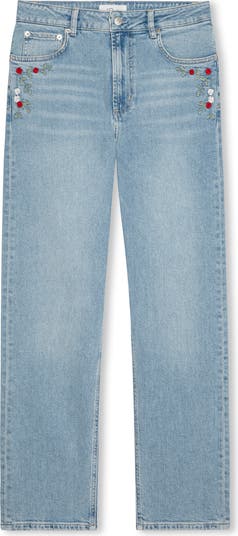 Made from washed low-stretch denim, these vintage-inspired jeans have a high waist, full-length straight legs and dainty rose embroidery at the pockets.