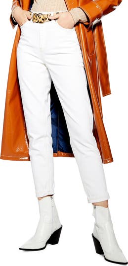 Contrast stitching and coppery hardware detail contemporary nonstretch mom jeans in striking off-white denim.