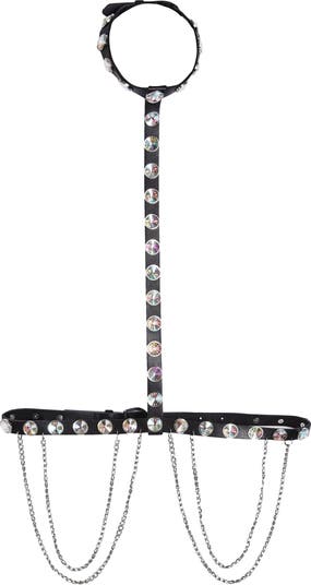 Complete your look with the edgy vibes of this faux-leather harness embellished with shimmering crystals and chain-link accents.