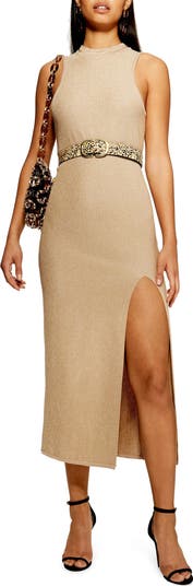 Sleek and shapely, this shimmering sweater-dress hugs your curves while a soaring side slit shows a little leg.