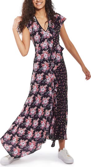 Double the floral prints equals double the romance in this ruffle-trim maxi dress with a open lace-up back to catch the cool spring night air.
