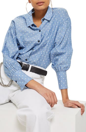 Spirited stars enliven a crisp chambray top styled with a smart spread collar and gathered, drop-shoulder sleeves.