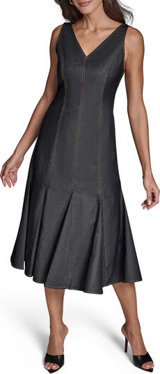 An elevated denim dress traces the swingy silhouette with contrast topstitching and closes the back with an elegantly edgy exposed zipper.