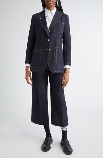 Tricolor grosgrain trim at the cuffs and back collar puts the label's signature stamp on this wool-blend longline blazer highlighted with contrast topstiching.