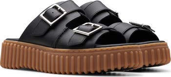 Adjustable straps lend easy wear to a leather slide sandal grounded by a cushioned footbed and grippy sole for added traction.