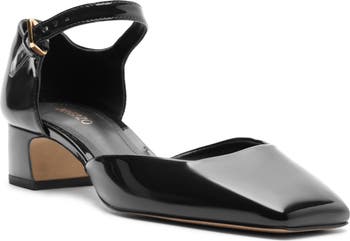 A squared-off toe and topline bring crisp angles and stunning dimension to a two-piece pump set on a low block heel and secured with an adjustable buckle closure.