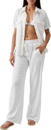 Lounge by the water feeling comfy in this cotton-blend terry cover-up shirt featuring gleaming snaps down the front.