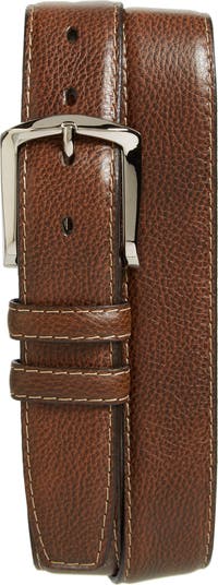 Glazed, milled Italian calfskin defines a handsome belt fitted with high-shine hardware.