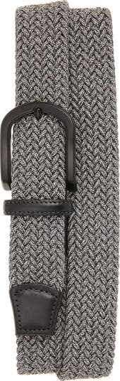 A curvy matte horseshoe buckle secures a tightly woven stretch belt made from cool mélange yarns.