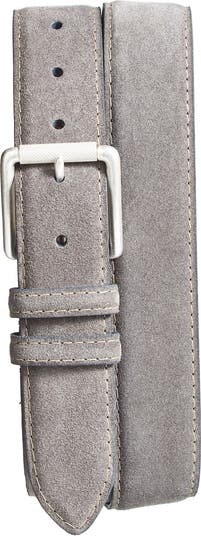Smart contrast topstitching outlines a supple suede belt secured with a striking white roller buckle.