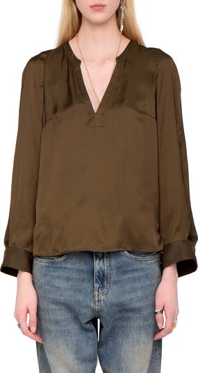 A split neck and breezy silhouette define a popover top made from lustrous satin.