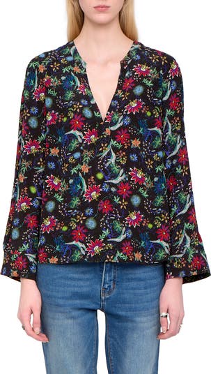 A surreal and colorful gardenscape unfolds across a flowy split neck top framed by voluminous sleeves.