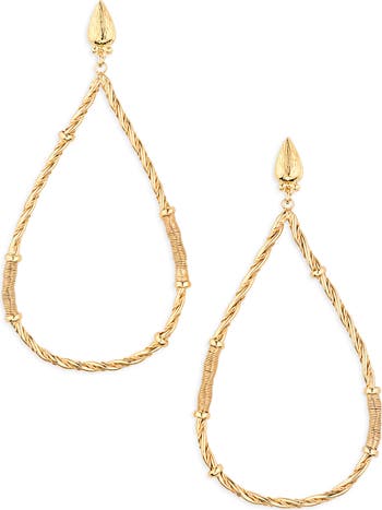 Golden plating that's twisted and adorned with rings adorn these teardrop-shaped drop earrings.