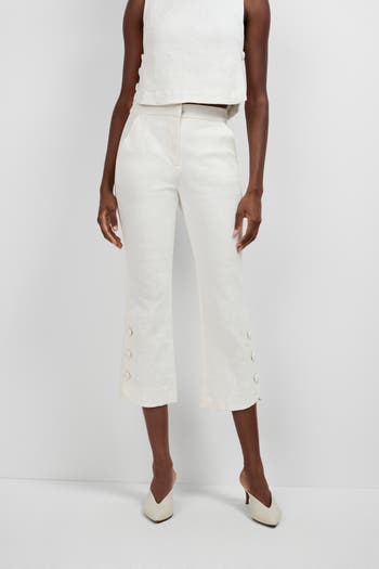 Cropped straight leg pant with a tulip hem and button detail along the hem