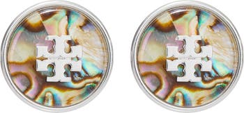 Inset abalone gives swirling color to these T-branded stud earrings.