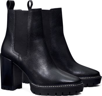 The classic Chelsea style is elevated on a block heel and treaded sole in this bootie lined with leather.