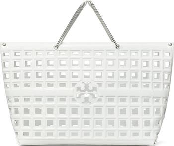 Kaleidoscopic cutouts of gridded squares and a signature stacked-T medallion breathe fresh life into this croc-embossed leather tote topped with metal handles inspired by traditional shopping baskets.