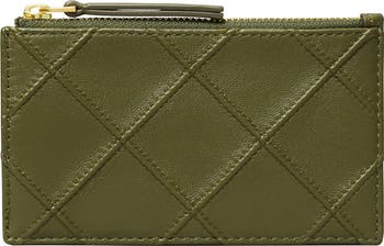 Signature quilting and an embossed Burch logo define a lambskin-leather card case designed with a top-zip closure and plenty of card slots.