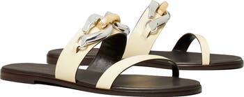 Mixed-media chain-link hardware and asymmetric straps bring an edgy aesthetic to a slide sandal shaped from smooth leather.