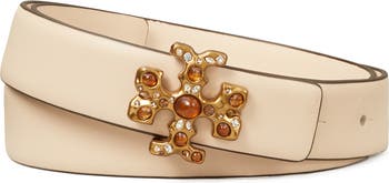 Embellished logo hardware lends chic distinction to a smooth leather belt with an adjustable prong closure.
