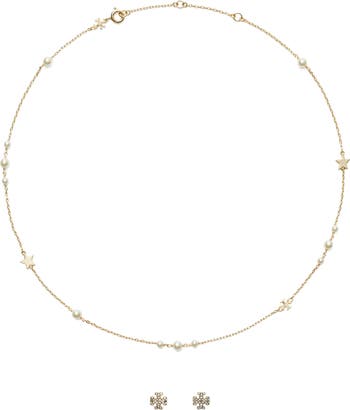 The perfect gift for the Tory Burch fan features a necklace with lustrous faux pearls and twinkling stud earrings that show off the brand's beloved logo.