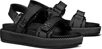 A cushy, contoured platform elevates the stature and the fun of a kicky slingback sandal topped with adjustable straps that cinch the sporty look and feel. Small logo hardware brings a polished pop to every step.