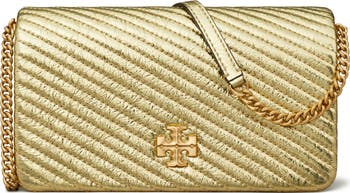 Diagonal quilting and a metallic finish distinguish this luxe leather wallet fashioned with an optional strap for hands-free carry.