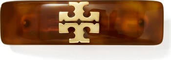 This rectangluar barrette with goldtone logo detailing is great for embellishing any hairstyle.