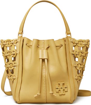A stacked-T logo appliqué and woven leather pattern define a sophisticated satchel outfitted with a drawstring closure and detachable strap.
