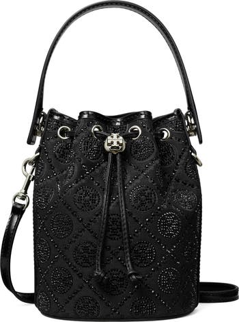 Sparkling embellishments elevate the logo-jacquard canvas on this scaled-down bucket bag featuring a drawstring closure cinched with a logo-embellished toggle. A top handle and removable crossbody strap offer versatile carrying options.