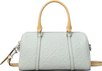 Tory's signature stacked-T monogram fully embosses the structured barrel body of this rich leather handbag suspended from an adjustable crossbody strap for effortless hands-free carry.