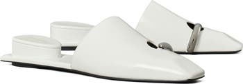 A hardware-detailed toe ring pierces the vamp of a rich leather mule fashioned with a slender square toe for statement-making appeal.