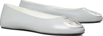 A signature logo medallion tops the rounded toe of the coveted Reva ballet flat updated with a new, slightly more generous fit.