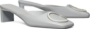 A circular hardware ornament highlights the squared-off toe and topline of a streamlined leather mule set on a low demi heel for a whisper of lift.