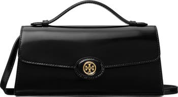 Signature double-T logo hardware stands out at the flap of a glossy leather bag fitted with a convertible strap that can be adjusted for shoulder or crossbody wear.
