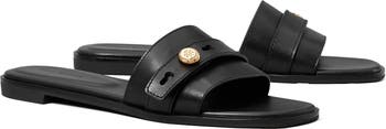 Polished logo hardware instantly elevates the look of this classic casual slide sandal.
