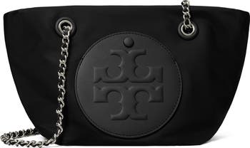 A prominent tonal logo shouts out some brand love for a right-size bag swung from a chain strap that offers two ways to carry.