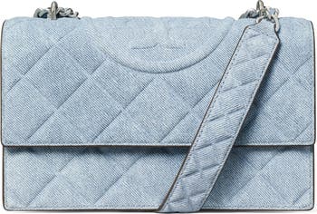 Signature quilting and a trapunto logo style this faded denim bag fitted with a convertible strap that can be worn crossbody or on the shoulder.