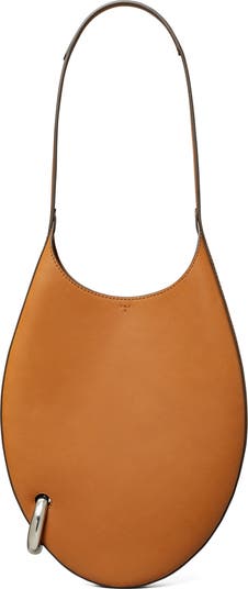 A single shining hoop pierces the smooth leather of a sized-down shoulder bag shaped in a contemporary teardrop silhouette. A subtle topstitched T brings tasteful branding to this sleek style.