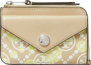 Embossed logos add a bold contrast to the supple leather exterior of a compact card case suspended from a circular ring perfect for attaching to your keys or favorite handbag while on the go.