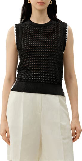 Radiating effortless vacation charm, this crochet-inspired crew neck knit tank is a timeless blend of craftsmanship and style. Made from a lustrous silk-cotton blend yarn, it feels soft, breathable, and cool against the skin. The design is elevated with delicate contrast shell embroidery, adding a touch of refined detail to its minimalist silhouette. Classic, versatile, and easy to style, it’s the perfect warm-weather staple—ideal for everything from seaside escapes to city strolls.