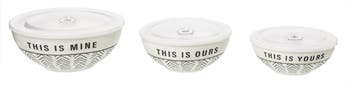 - The Yours/Ours/Mine Bowls with Lid Set of 3 in elegant ceramic white make the perfect gift for any occasion, whether it's the holidays, a wedding, or Mother's Day.